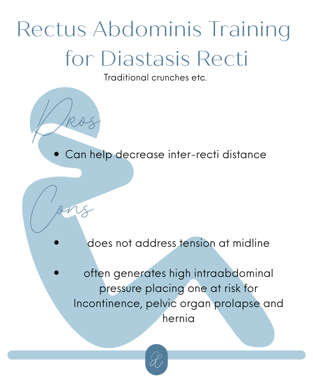 The biggest draw back to these exercises is that they rely on voluntary muscle activation and are often done incorrectly. When done incorrectly these types of exercises can result in compensatory activation of your retus abdominis. This compensation places you at the same risks discussed above. I want to stress again that these exercises can be wonderful, but when you do them with the rectus as your primary activator as opposed to TA they can actually put you at risk for pressure problems such as prolapse and incontinence.